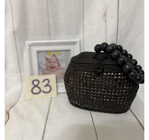 A finely crafted, Anthropologie hand‑woven basket purse in deep black, featuring a domed fitted lid and an oversized loop handle composed of large spherical beads. Clean, sculptural lines and a textural open weave make this an elegant decorative accessory or display object—striking as a standalone sculptural piece or as part of a curated collection.