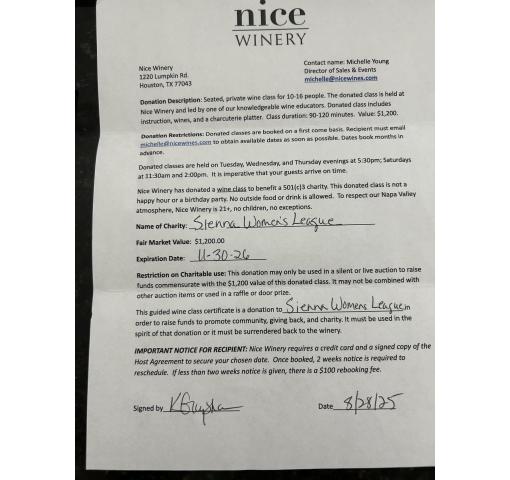 Gather friends and indulge your senses with this exclusive Nice Winery wine class for 10–16 guests. Experience expert-led tastings, learn about varietals, and discover new favorites in an inviting, educational setting. Perfect for wine lovers and social butterflies, this package offers sophistication, laughter, and connection. Sip, swirl, and savor each moment—it’s a journey through flavor and friendship proving great wine tastes better when shared. Bid generously and toast to unforgettable evenings among the vines tonight. Scroll pictures for certificate. Expires 11/30/2026.